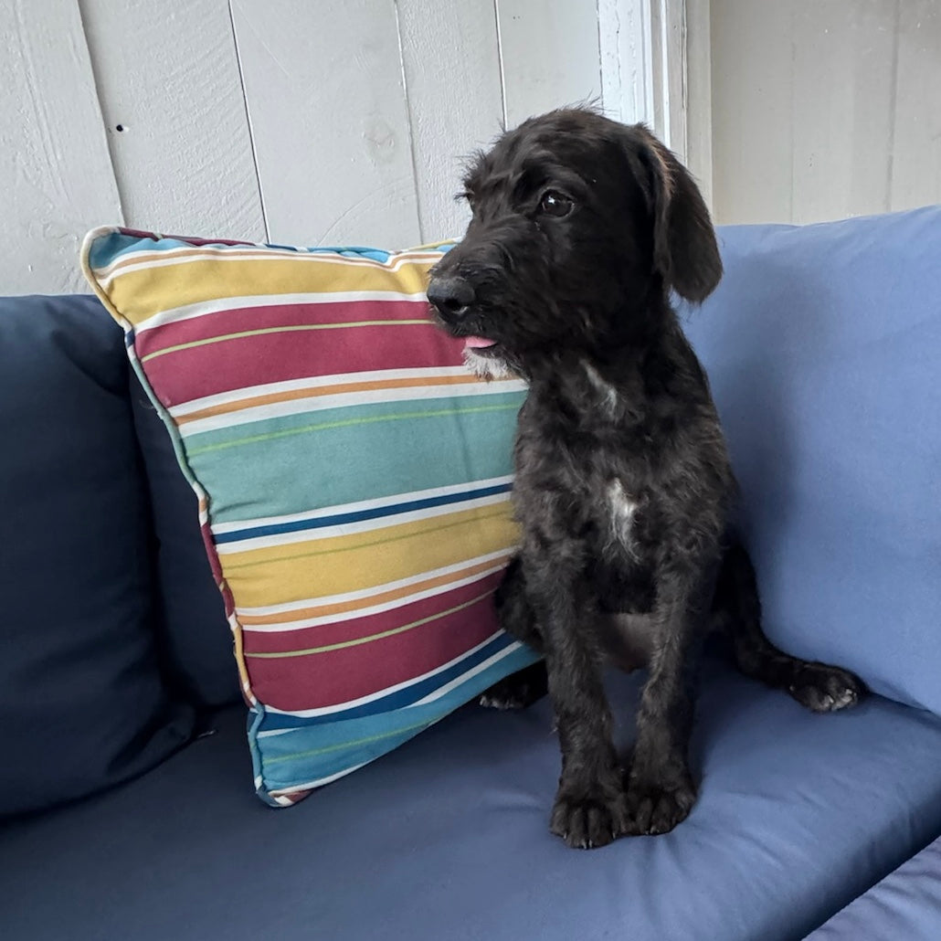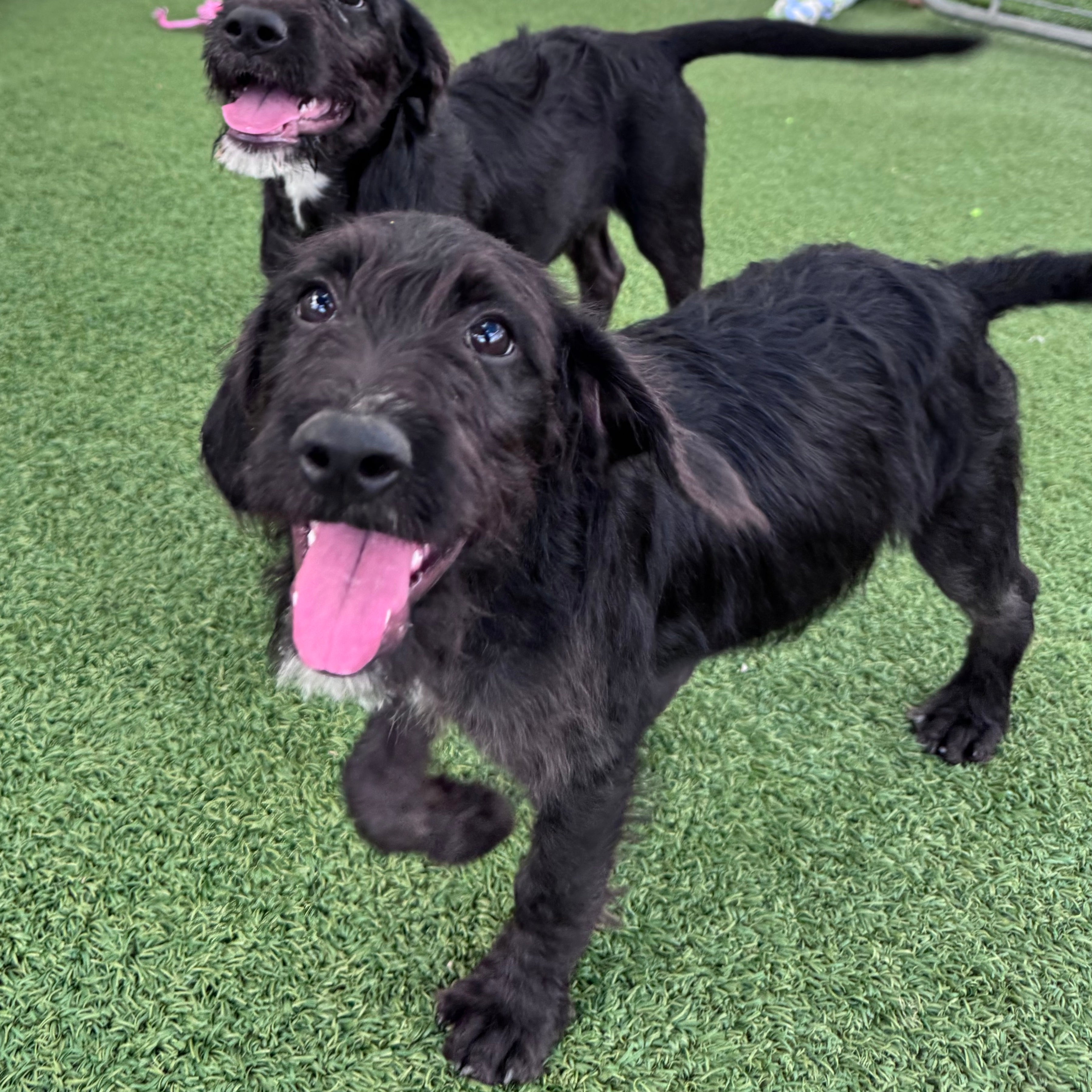 We “think” Eloise and Agnes are a mix of poodle + pointer or schnauzer, with their grown size likely landing between 25–45 lbs. At just 3 months old, they’re ready to wiggle their way into a forever home!