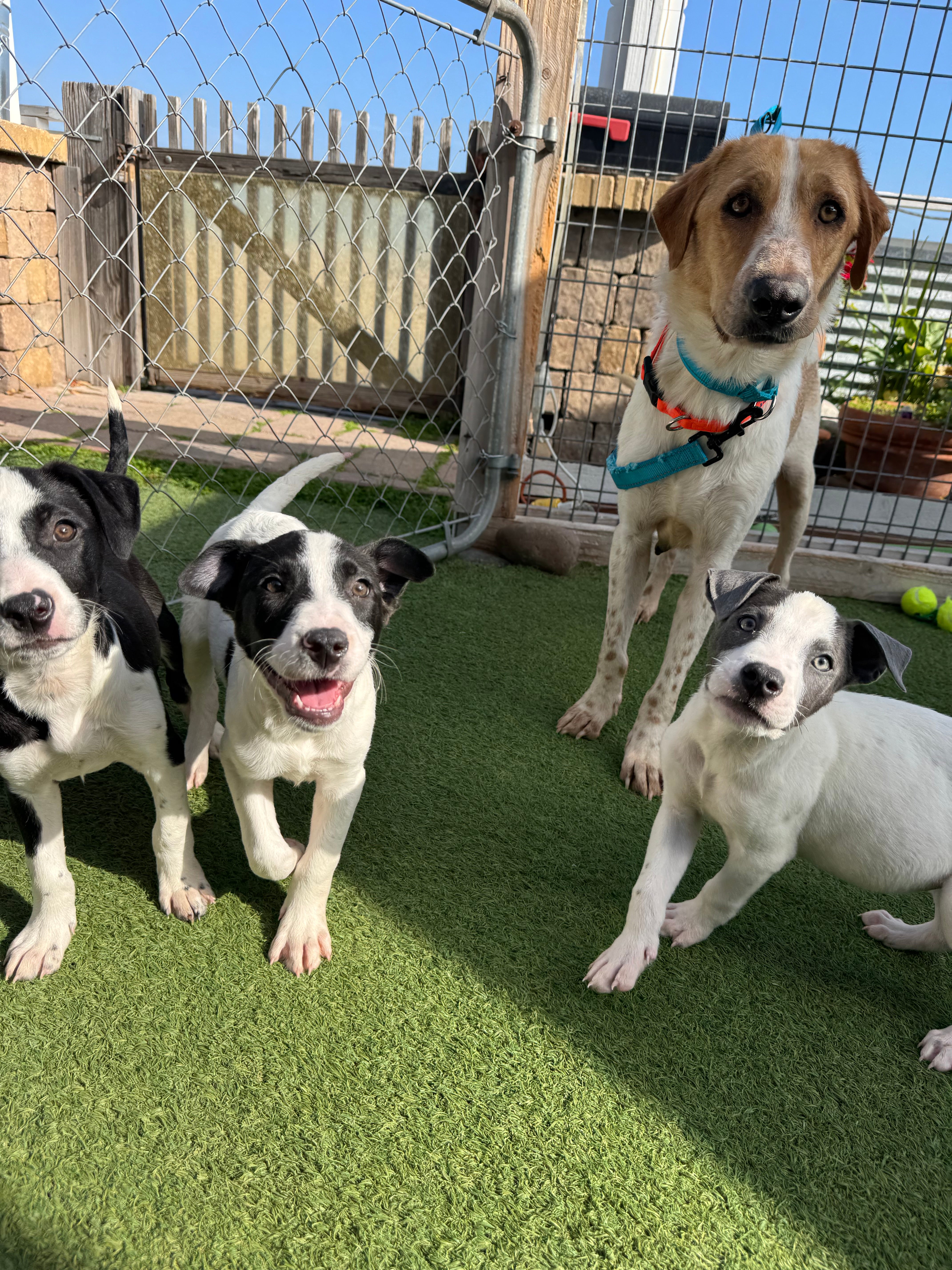 Tracy’s Pack Tracy’s Pack is made up of three sweet girls and one handsome boy, all rescued alongside their devoted mama, Tracy. Found as strays in the Central Valley, these pups had a rough start—but thanks to their amazing mom, they’ve grown into happy, curious, and loving little souls. Now 8 weeks old, Tracy’s Pack is at the perfect age to start their next chapter. They appear to be an American Foxhound / Pit mix (best guess!), which means they’re likely to grow into loyal, affectionate, and fun-loving companions. These babies are playful, snuggly, and full of puppy joy. They love to explore, tumble with their siblings, and curl up for naps after a good round of play. Raised by a gentle, well-mannered mama, they’ve had a beautiful start learning how to be kind, social pups. 3 girls, 1 boy Age: 8 weeks Breed guess: American Foxhound / Pit mix Temperament: Sweet, playful, curious, affectionate These pups are ready to find families who will love them, guide them, and grow with them. If you’re looking for a loyal best friend with a heart full of love, one of Tracy’s Pack may be your perfect match.