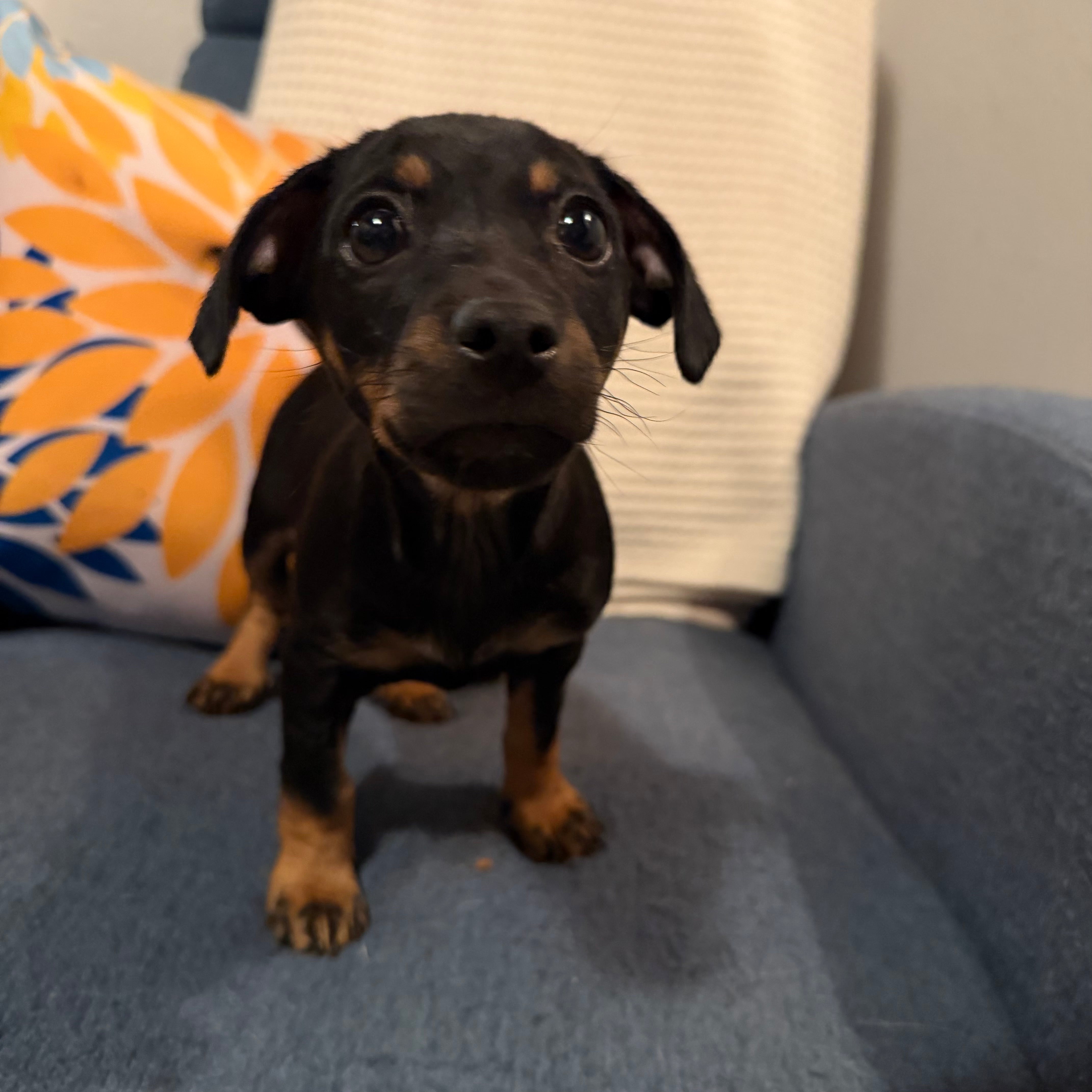 We believe they are Miniature Pinscher mixes, with those alert little faces, curious eyes, and spunky personalities that make MinPins so special. They may be small, but their hearts are mighty.
